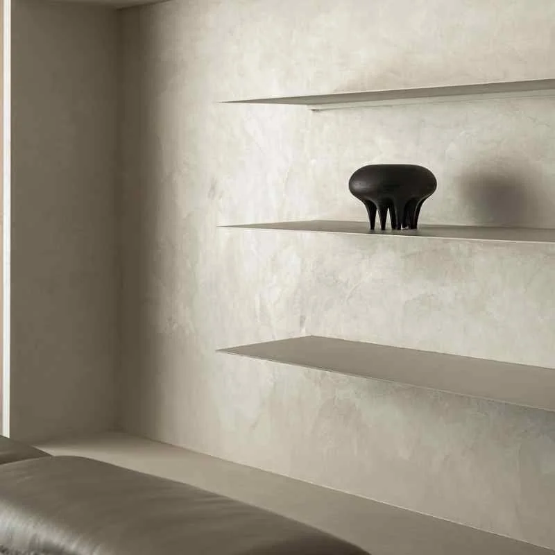 Animamundi is a decorative metallic plaster that reinterprets the raw character of concrete through a more elevated, architectural lens. Inspired by the idea of washed-out concrete, it introduces soft pearl undertones and subtle metallic movement, creating depth without overpowering a space.